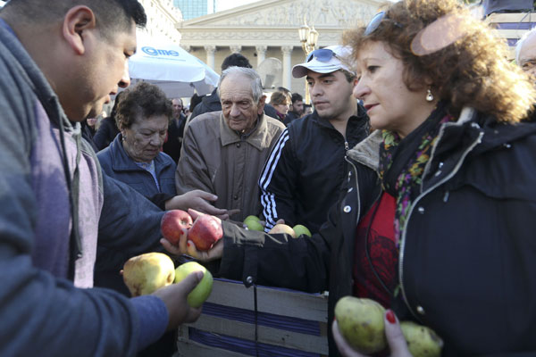 Ayer, centenares de personas protestaron frente del Casa Rosada y repartieron diez toneladas de peras y manzanas producidas al sur del país vecino. Reclaman que el sector está en la quiebra y que peligran 60.000 puestos de trabajo, debido a las grandes diferencias que se paga al productor en comparacion con el precio que cancelan los consumidores.