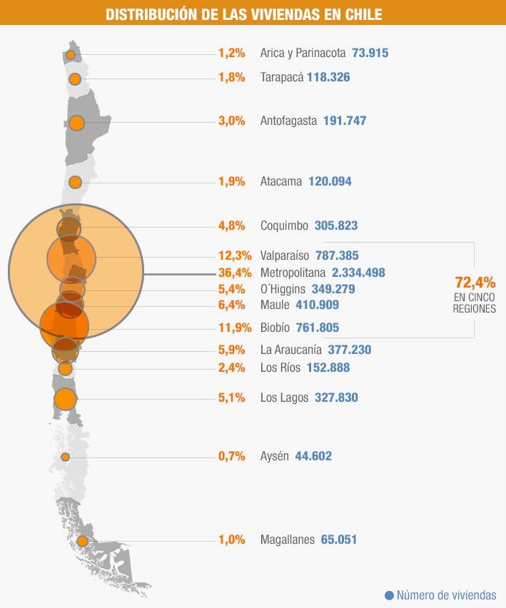 En las zonas extremas del país hay una alta concentración de viviendas en las capitales regionales, incluso con más del 50% del total regional. Es el caso de Arica (95,2% del total regional), Iquique (57,3%) y Antofagasta (57,1%) por el norte, y Coyhaique (53,1%) y Punta Arenas (76,1%) por el sur.