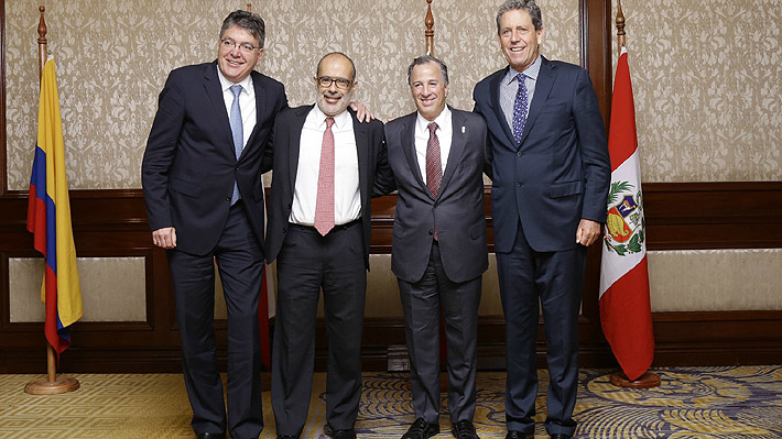 El titular de Hacienda, Rodrigo Valdés; el colombiano Mauricio Cárdenas, y el ministro peruano de Economía y Finanzas, Alfredo Thorne, le mostraron a su colega mexicano, José Antonio Meade, su respaldo en el marco de la XII Reunión de Ministros de Finanzas del bloque, que se celebró este viernes en Santiago.