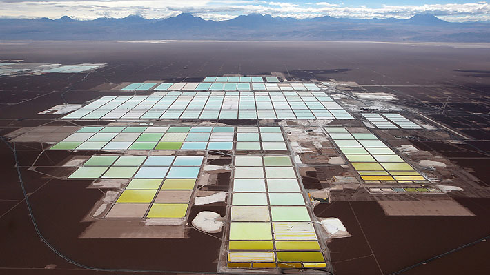 Vista aérea muestra las piscinas de salmuera y las áreas de procesamiento de la mina de litio SQM, en Atacama.