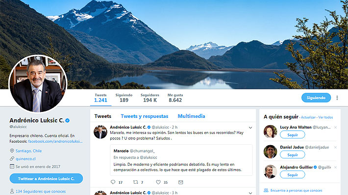 SANTIAGO.- En enero de 2017, el empresario chileno Andrónico Luksic entró de lleno al mundo de las redes sociales y se creó una cuenta de Twitter, en la cual se ha caracterizado por opinar y responder a otros tuiteros.