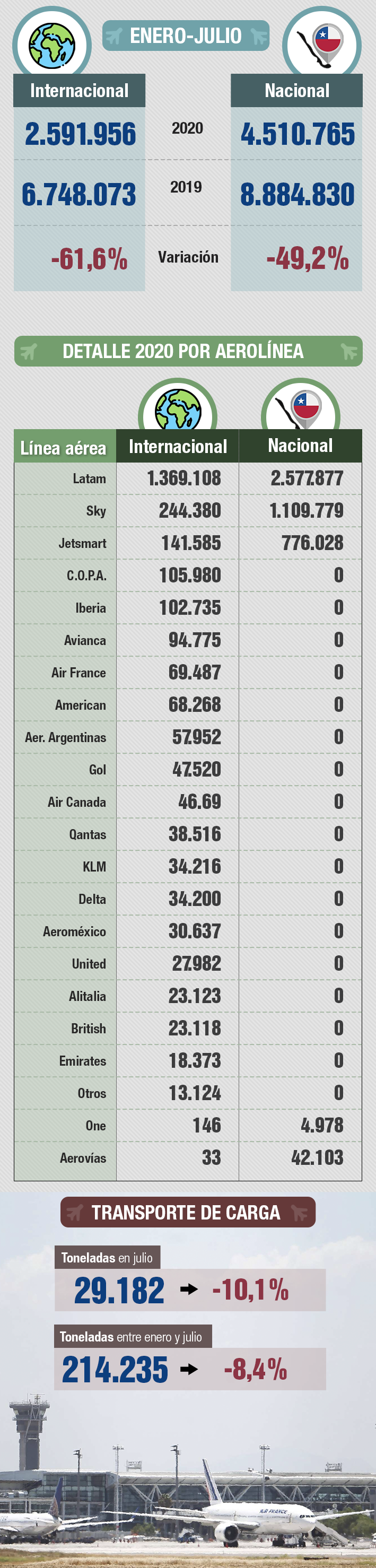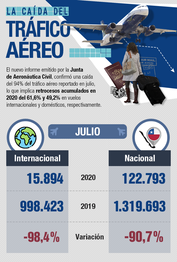 Según los últimos datos de la Junta de Aeronáutica Civil, las caídas del período entre enero y julio son de 61,6% y 49,2% en vuelos internacionales y domésticos, respectivamente.