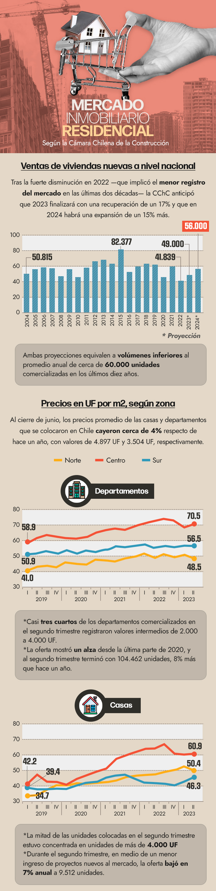 Según la CChC, se comercializarán 49 mil unidades este año y 56 mil el siguiente. Sin embargo, continúan siendo inferiores al promedio anual de 60 mil unidades en los últimos 10 años.
