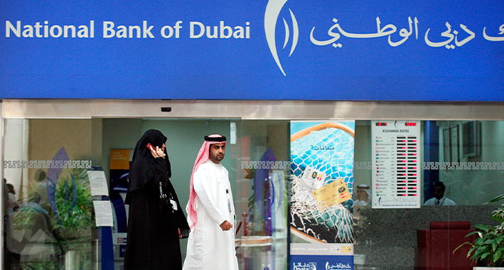 Mujer y hombre en el Banco Nacional de Dubai. | AFP