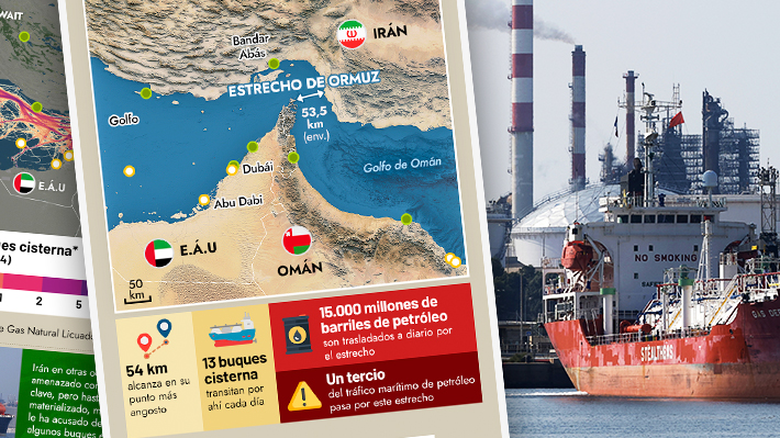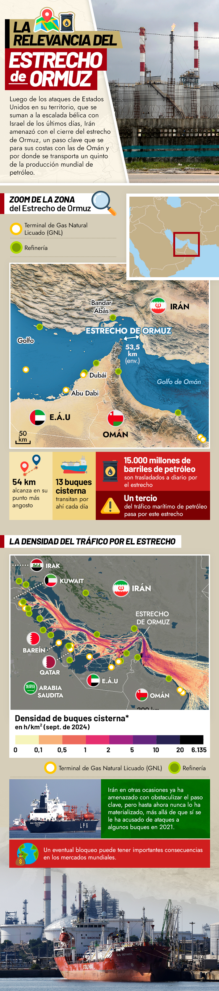 Diseño de Infografía: Michel Leiva M., Emol | Edición: Felipe Vásquez N., Emol | Fuentes: AFP / EFE / Bloomberg al 19 de junio de 2025 (terminales de GNL y refinerías) / Datos cartográficos: OSM, Gebco, NASA
