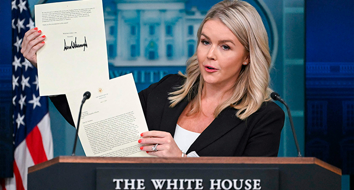 La secretaria de prensa de la Casa Blanca, Karoline Leavitt, enseña las cartas enviadas por Trump a Corea y Japón. | AFP