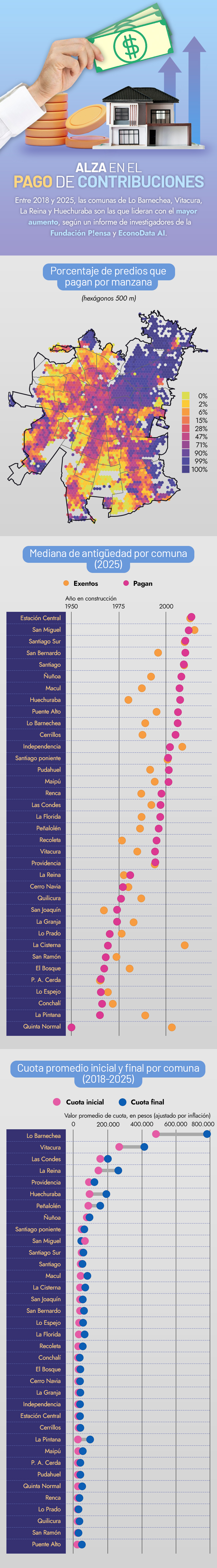 Investigadores de Fundación P!ensa y EconoData AI analizaron datos del SII para analizar la subida de este impuesto en comunas de la Región Metropolitana.
