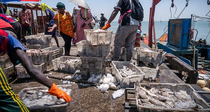 Trabajadores descargan pescado de un barco pesquero industrial en Gambia. | AP