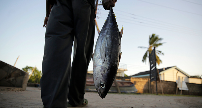 Pescador sostiene un atún de aleta amarilla en Kenia. | AP