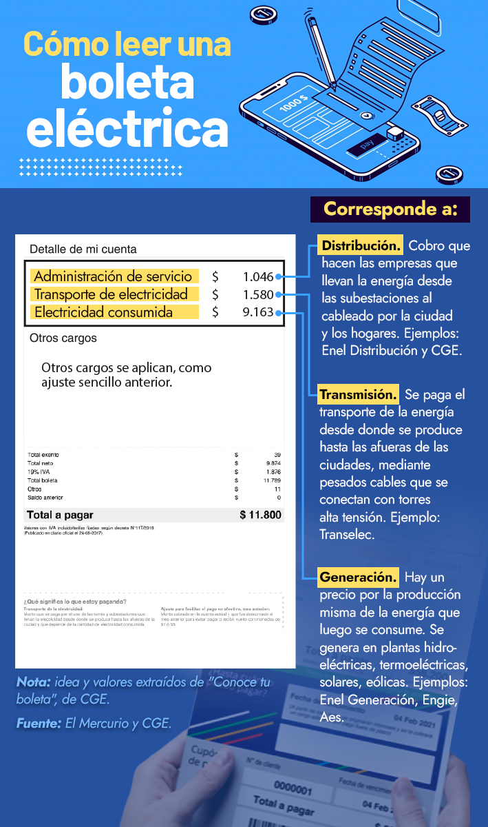 Es precisamente en la boleta en donde se detalla lo que el cliente paga a cada actor de la industria. Por ejemplo, en la cuenta aparece un cobro por "transporte de electricidad", que considera la transmisión.