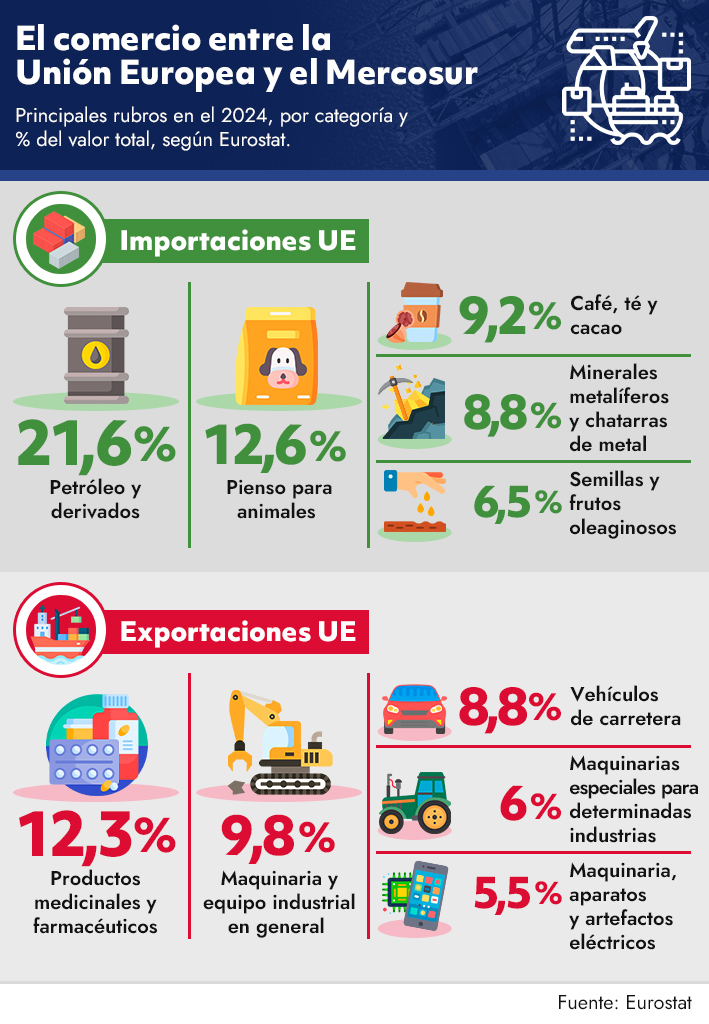 El tratado prevé la eliminación gradual de aranceles sobre casi todos los bienes intercambiados entre ambos bloques a lo largo de 15 años, aliviando presiones sobre sectores sensibles como la industria automotriz, los lácteos, la carne y el vino. Impulsado por líderes como el presidente brasileño Luiz Inácio Lula da Silva y la presidenta de la Comisión Europea Ursula von der Leyen, el acuerdo destrabó su firma tras superar resistencias internas en Europa, aunque aún deberá ser ratificado por los parlamentos de ambas partes.