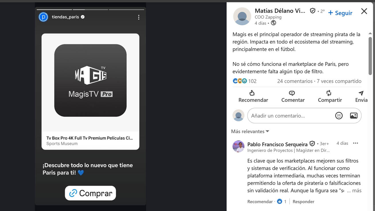 "Magis es el principal operador de streaming pirata de la región. Impacta en todo el ecosistema del streaming, principalmente en el fútbol", señaló Délano. "No sé cómo funciona el marketplace de Paris, pero evidentemente falta algún tipo de filtro", agregó.