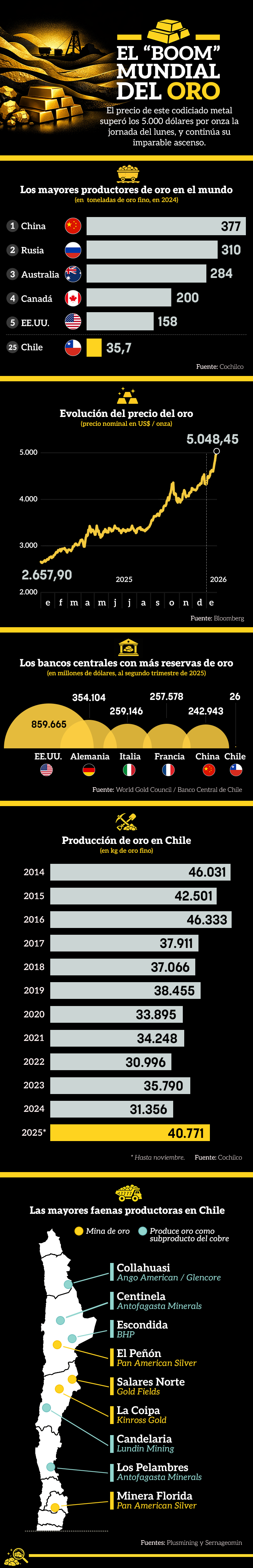El "boom" mundial del oro: Cuáles son los principales productores y la posición de Chile en el mercado