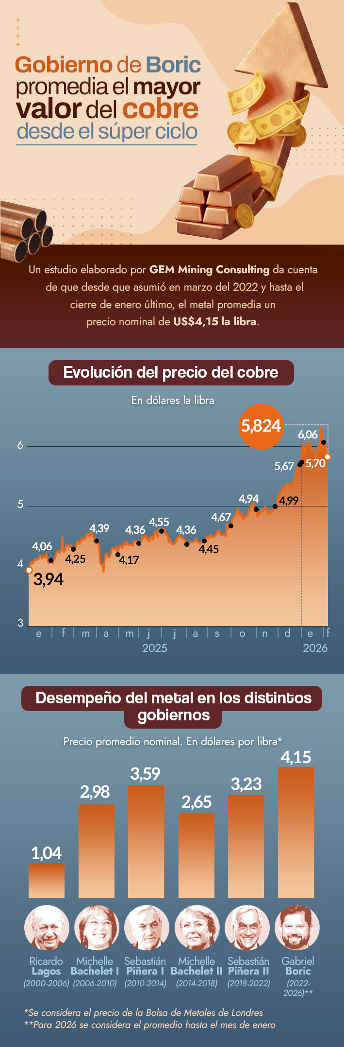 En el marco de la actual administración, el precio nominal del metal alcanzó un promedio de US$4,15 la libra.