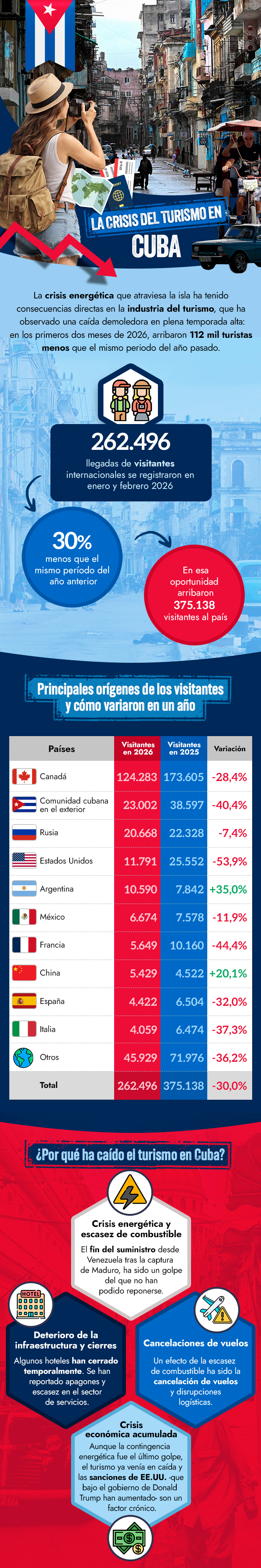 La caída del turismo en Cuba: El 2026 comenzó con un 30% menos de visitantes en medio de crisis
