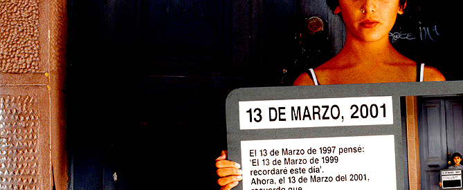 "Data" –como su nombre lo indica– es una reflexión visual sobre el tiempo vinculado con el acto de la representación y la memoria. Así es, pues el artista visual Gonzalo Díaz solicitó al fotógrafo Jorge Brantmayer que durante ocho años tomase fotografías en lugares determinados, siempre el mismo día: el 13 de marzo.De este modo, se aprecia el paso del tiempo y cómo varía la percepción de los espacios.