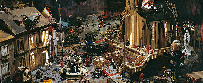 A través de esculturas y de una instalación, elaboradas con elementos cotidianos como cartones, plásticos, materiales de maquetería, pintura y juguetes intervenidos, el artista chileno plantea una vivencia barroca que tensiona precariedad y fastuosidad, cruzando referencias religiosas, políticas, culturales y económicas, propias de la globalización.