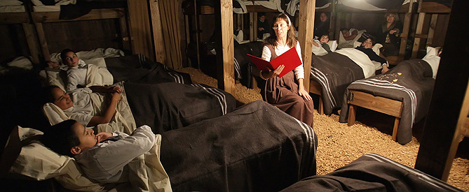 Cincuenta camas están ubicadas en un escenario. El público se acomoda en ellas y comienza la función. Una narradora se ubica en el centro de toda la audiencia y relata la historia de Pulgarcito, un niño diminuto que es abandonado en un bosque por sus padres, junto a sus seis hermanos. Perdido y en medio de la desolación, el pequeño no se deja vencer y decide luchar. Se sobrepone a una tormenta, conduce a sus hermanos hasta el refugio de una casa, mientras en la oscuridad, los acechan los lobos. De pronto, descubre que la vivienda pertenece a un ogro feroz y lo invade el miedo.