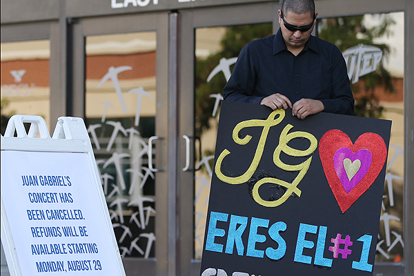 EL PASO.- Docenas de fanáticos de Juan Gabriel se comenzaron a reunir el domingo en la noche en el frontis del teatro en el que el "Divo de Juárez" tenía pronosticado ofrecer un concierto anoche.