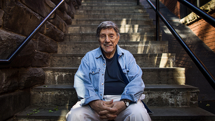 William Peter Blatty sentado en los icónicos escalones de la película "El exorcista" en Georgetown.