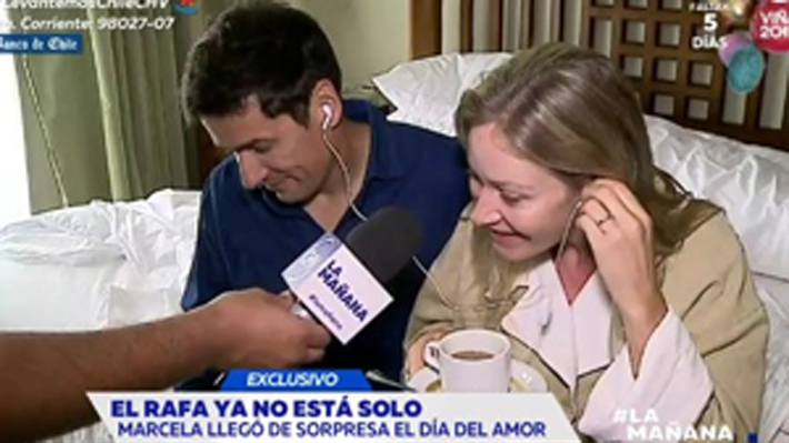 SANTIAGO.- Una inesperada visita recibió esta mañana Marcela Vacarezza en la habitación del hotel en que se aloja junto a su esposo, Rafael Araneda, en Viña del Mar. La nueva panelista de "Muy buenos días" se encontraba tomando desayuno en bata, a cara lavada, cuando un notero de "La mañana" ingresó a su pieza para saludarla.