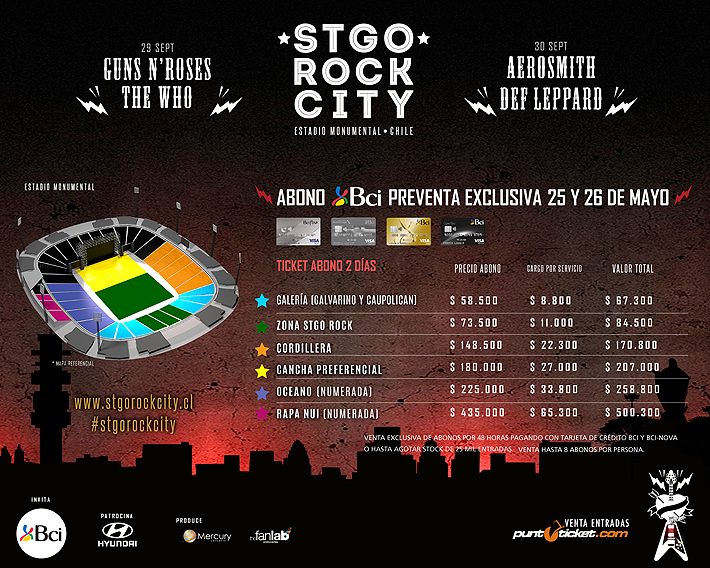 SANTIAGO.- Las coordenadas para uno de los mayores eventos musicales del año ya están definidas. El próximo 29 y 30 de septiembre el Estadio Monumental acogera a Guns N' Roses, The Who, Aerosmith y Def Leppard en la primera versión del Festival Stgo Rock City.