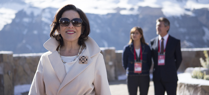 Y fue esta historia, a través del guión, la que atrajo al proyecto a Paulina García. Invitada por el mismo Mitre, la actriz tiene en cuenta que su rol no va más allá de lo que es. En la ficción trasandina encarna a Paula Scherson, la Presidenta de Chile y anfitriona de la cumbre de políticos, que se realiza en un hotel en plena cordillera de los Andes.