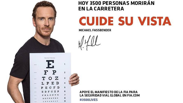 SANTIAGO.- Son cerca de 3.500 muertes diarias, a nivel global, las que suceden por accidentes de tránsito. Con esa consigna, la Federación Internacional del Automóvil (FIA), a la que el Automóvil Club de Chile (ACChi) representa en el territorio nacional, impulsó la campaña #3500LIVES, en la que 13 personalidades del mundo dan cara. Uno de ellos, el actor nacido en Alemania y nacionalizado irlandés Michael Fassbender, fue elegido "especialmente para el territorio nacional". La campaña se muestra en gráficas y pantallas en la ciudad.