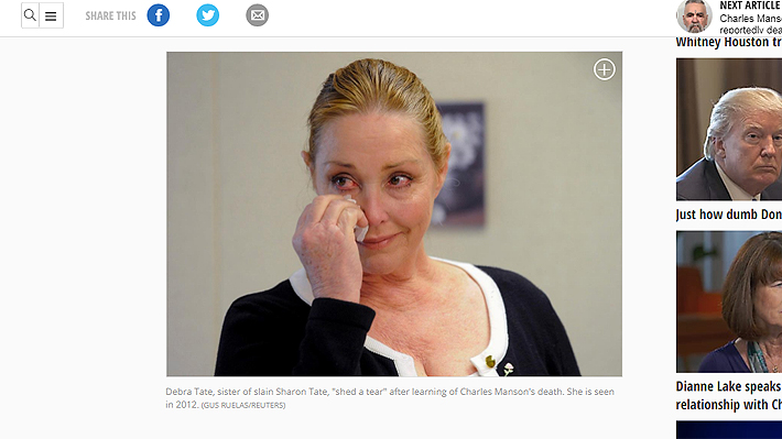 SANTIAGO.- A las 20:30 horas de ayer, Debra Tate recibió un llamado telefónico de los funcionarios penitenciarios, quienes le informaron que 15 minutos antes Charles Manson, el responsable de la muerte de su hermana Sharon Tate ocurrido en agosto de 1969, había dado su último respiro.