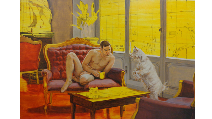 En galería Madhaus se exhibe la obra "Pesebre 6" de Paula Solís, que pertenece a una serie de pinturas en que la artista combina figura humana y animales en escenarios ostentosos. "Hago figuras humanas desnudas para situarlas al mismo nivel que los animales, en estado de vulnerabilidad", explica la artista. "Prefiero pintar figuras masculinas porque considero que han sido menos representadas que el cuerpo de la mujer", agrega. Solís estudió en la Universidad de Chile y aunque no llegó a graduarse de la carrera, ha expuesto sus obras en espacios como el Centro Cultural Chimkowe, Casas de lo Matta y el Casino de Viña del Mar. En 2017 celebró su primera exposición individual en la Biblioteca Viva del Mall Tobalaba. Su obra se compone principalmente de pinturas, óleos sobre tela, pero también tiene obras de otros materiales como acuarelas o acrílicos. "Como artista joven, si tienes la disposición, puedes postular a muchas convocatorias durante el año", dice. "Yo he hecho mi carrera postulando a cosas y no esperando que me lleguen las oportunidades", añade.