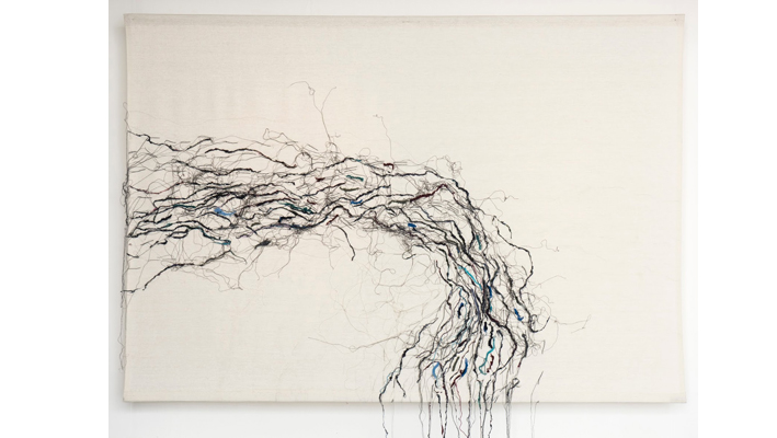 Dibujos hechos en máquina de coser con hilos de algodón y huaipe, son las obras que Petra Gajardo muestra en Galería Infrarrojo. "Probé con el huaipe de distintas maneras, seleccioné hilos y retazos de telas de colores que me llamaran la atención y que podrían ser incorporados a la tela para crear puntos de tensión", explica la artista. Gajardo se tituló de Arcis, luego cursó un intercambio en la École supérieure des beaux-arts en Marsella, Francia. Para 2018 ya alista tres exposiciones individuales, una en Worm Valparaíso, otra en la Sala de Extensión de la Universidad de Talca y una en Galería Infrarrojo. Del panorama actual del arte joven en Chile, Gajardo opina: "Hay muchas variantes de miradas y siento que el tema de hoy son los nuevos lenguajes. Volví a ver artistas jóvenes interesados en trabajar la piedra, la madera, cosa que uno creía que esa área de la escultura se podía perder, pero llegan con una impronta personal y carácter. El dibujo y el textil también cada vez toman más fuerza a nivel de ideas, conceptos y nuevas aproximaciones sobre los materiales".