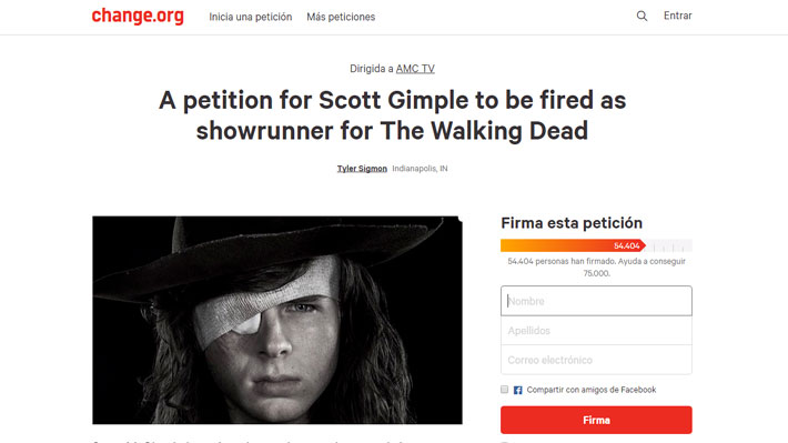 SANTIAGO.- Los fanáticos de la serie de zombies "The Walking Dead" están enojados con el responsable de la producción debido un reciente suceso que motivó a los seguidores a juntar firmas en el sitio Change.org para pedir la salida del responsable de la ficción, Scott M. Gimple. La petición ya ha reunido más de 54 mil adherentes.