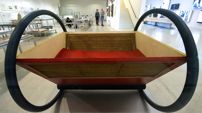 Los visitantes caminan detrás del credle (1922) de Peter Keler durante la vista previa de la prensa antes de la apertura del nuevo Museo. Crédito: AP