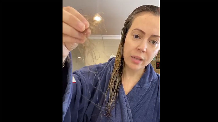 quería mostrarles la cantidad de cabello que se sale de mi cabeza como resultado del covid-19", dice Milano en la grabación. Luego