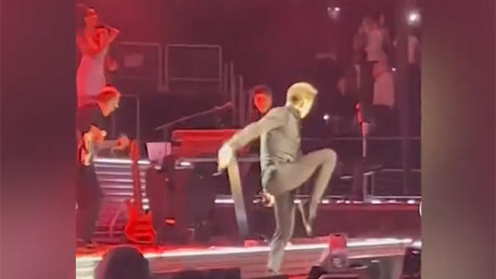 el cantante hace uno de sus característicos movimientos de pierna y de inmediato se lleva su mano al glúteo derecho, dejando la impresión de que sufrió un fuerte "tirón".