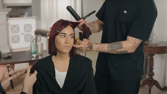 tiene la chasquilla tomada para facilitar el proceso de maquillaje.