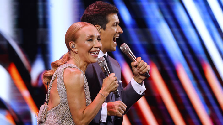 A las 21:15 horas, los animadores Rafael Araneda y Karen Doggenweiler para dar la bienvenida al público y presentar al jurado. En ese instante, rindieron un homenaje al artista fallecido esta tarde a los 70 años.