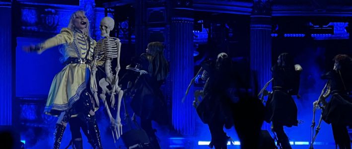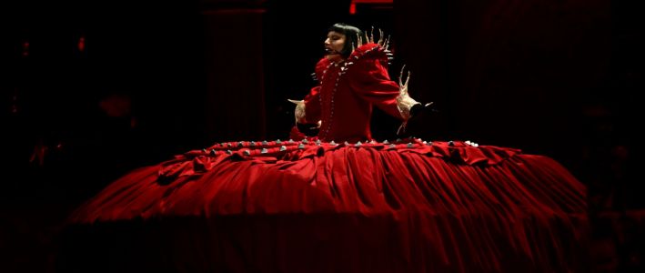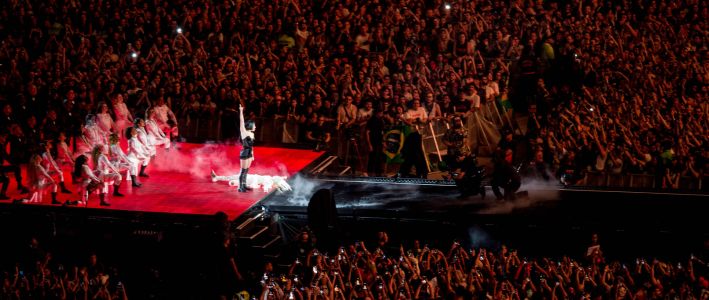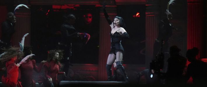 Vestida con un vibrante traje rojo, sobre una estructura victoriana y en medio de un gigantesco escenario de 1.260 metros cuadrados que evocaba un teatro griego, la superestrella del pop inauguró el espectáculo interpretando 'Bloody Mary'.