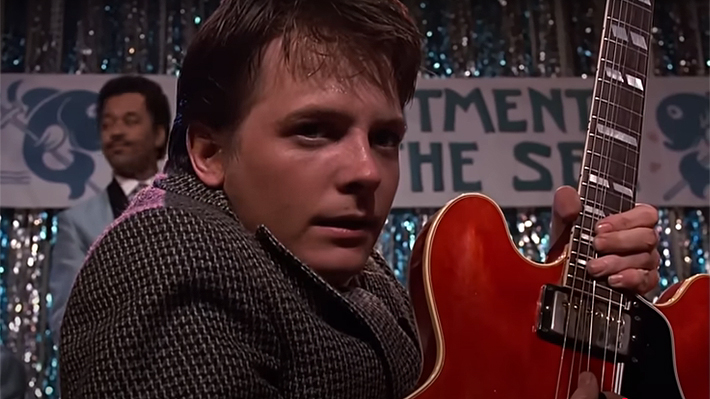 Marty McFly (Michael J. Fox) tocando la guitarra perdida en el baile "Enchantment Under the Sea" de la famosa película.