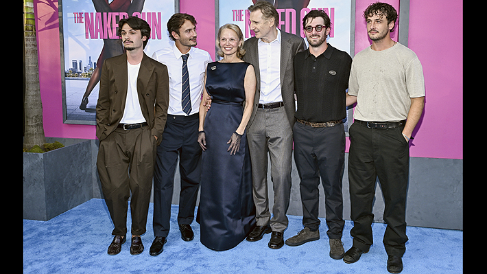 Pamela Anderson y Liam Neeson junto a sus respectivos hijos en la alfombra roja de "¿Y dónde está el policía?" en Nueva York. Crédito: AP.