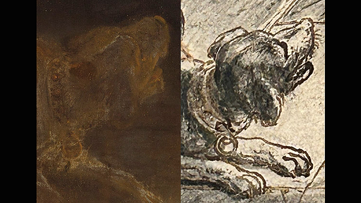Rembrandt, sin embargo, introdujo cambios significativos en su versión final. En el dibujo original, el perro está echado y tranquilo, mientras que en "La ronda de noche" el pintor lo puso sobre las cuatro patas, más alerta, para reaccionar al estruendo del tambor en medio de la mítica escena abarrotada de milicianos que dibujó Rembrandt (1606-1669).