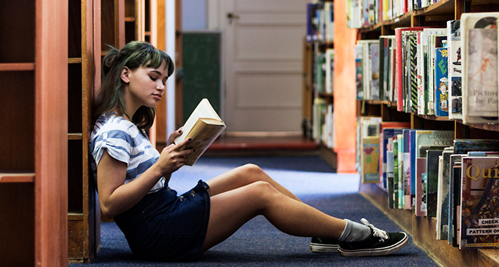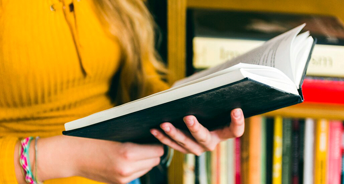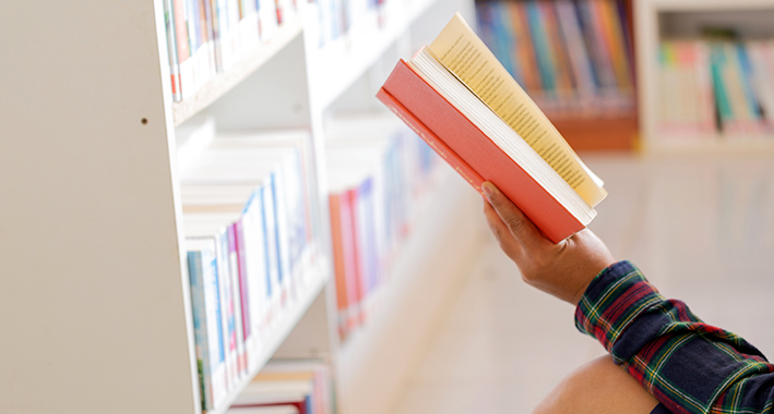 Fotografía referencial de joven leyendo libro que sacó de un estante. | Freepik