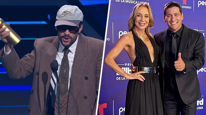 Bad Bunny con uno de sus premios (izquierda), y Karen Doggenweiler y Rafael Araneda en la alfombra azul de los Billboard Latinos 2025.