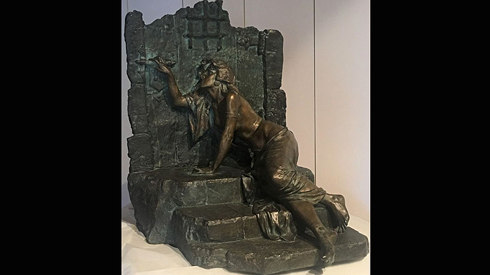 "figura femenina semi recostada de perfil derecho sobre tres escalones que enfrentan una puerta con cerrojo y una pequeña ventana de tres barrotes verticales y dos horizontales", según describe la plataforma Chile Patrimonios.