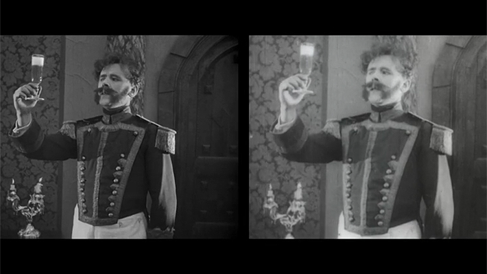 Imagen de una escena de "El Húsar de la Muerte" en 4K (izquierda) comparada con la original (derecha).