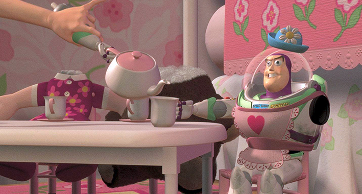 Cuando Buzz Lightyear pierde la cordura y cree ser "la señora Nesbitt", ¿con quiénes se encuentra "tomando el té"?