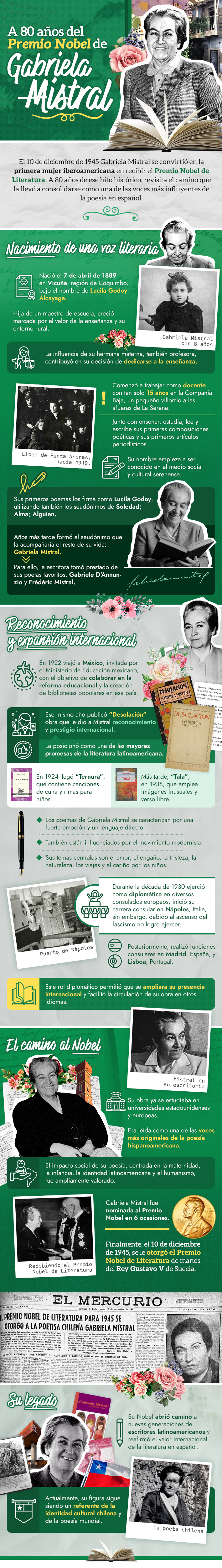 Diseño de Infografía: Michel Leiva, Emol. | Contenido: Vladimir Núñez, Emol. | Fuente: Memoria Chilena / Nobel Prize / Camino a Gabriela Mistral / Gabriela Mistral Foundation.
