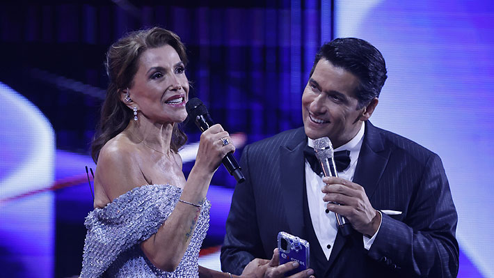 El animador del Festival de Vina 2026 Rafael Araneda y la coanimadora Carolina Arregui durante la primera noche del certamen.