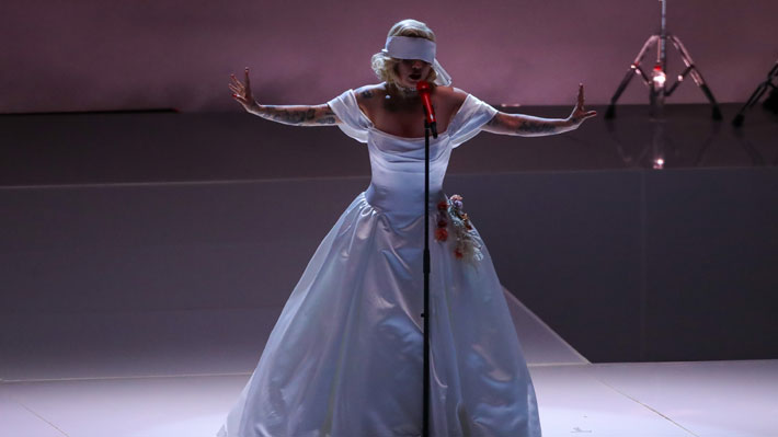 Con un vestido blanco, los ojos vendados y un look estilo Marilyn Monroe, la artista nacional inició su presentación con las manos amarradas y al son de "Mi Hombre", coreada por todo el público y en una versión muy emotiva. Luego, cantó Femme Fatale, que encendió a toda la Quinta Vergara.