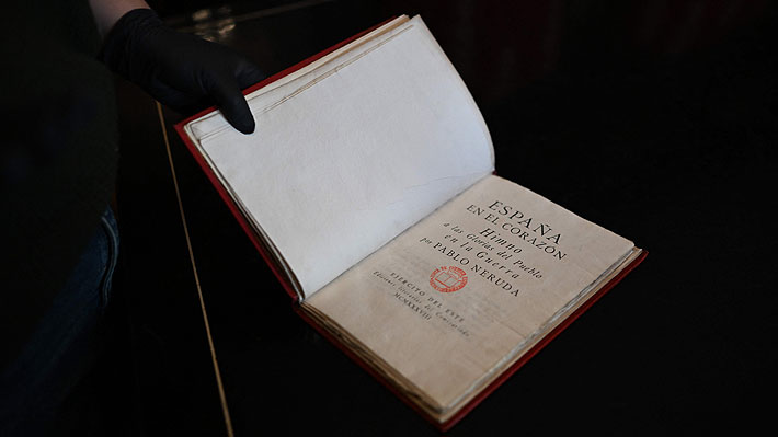 raro ejemplar de un libro sobre la Guerra Civil española (1936-1939) del poeta chileno y premio Nobel de Literatura